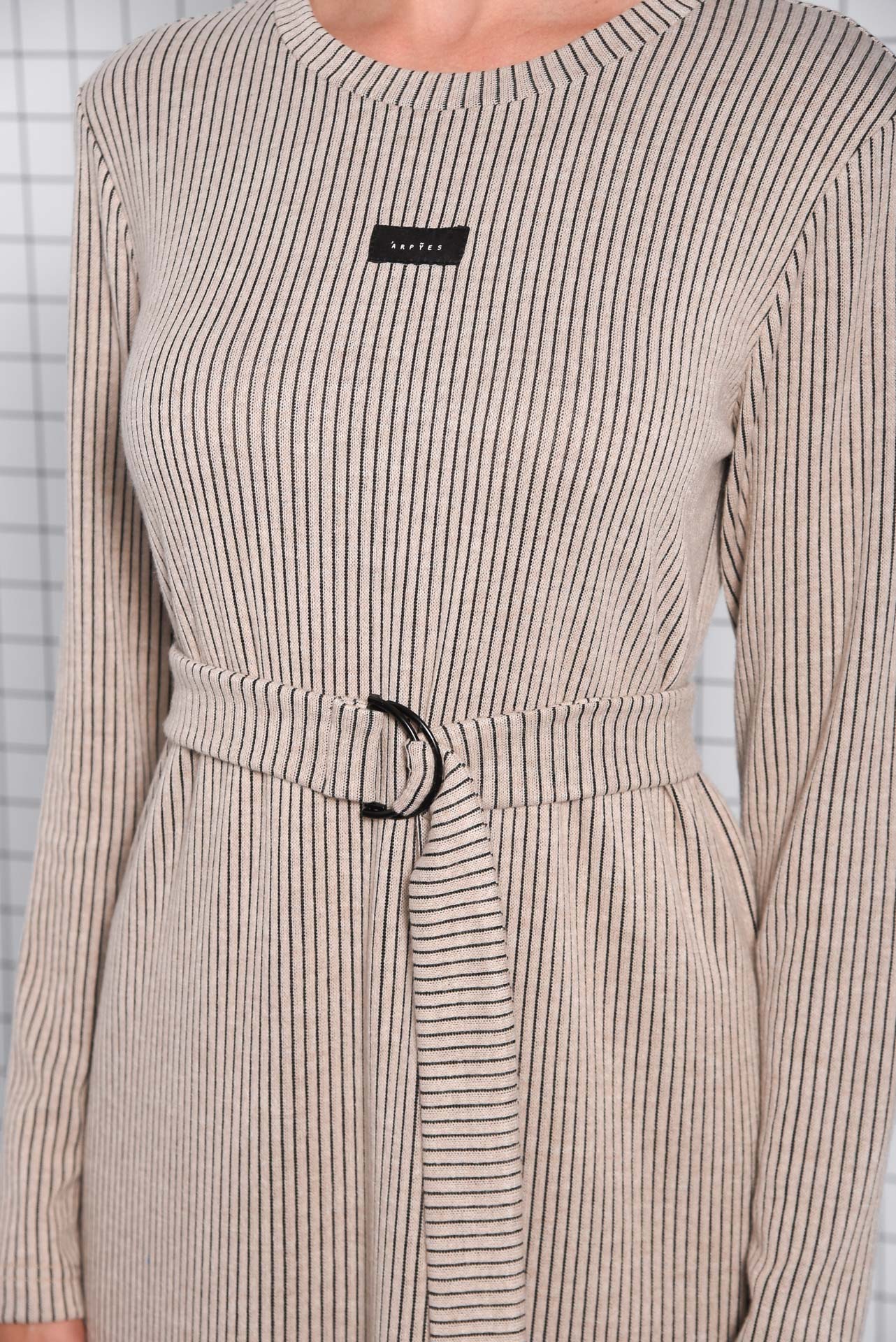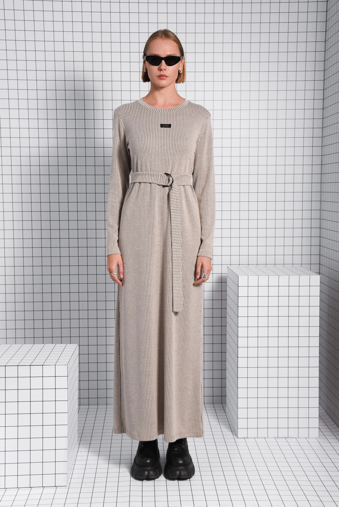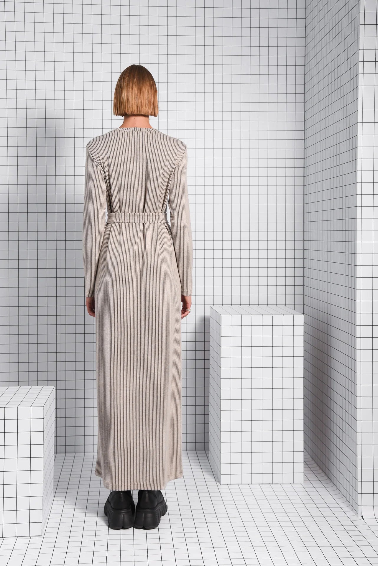 Μακρύ φόρεμα σε άνετη γραμμή με ζώνη από το ίδιο ύφασμα.
