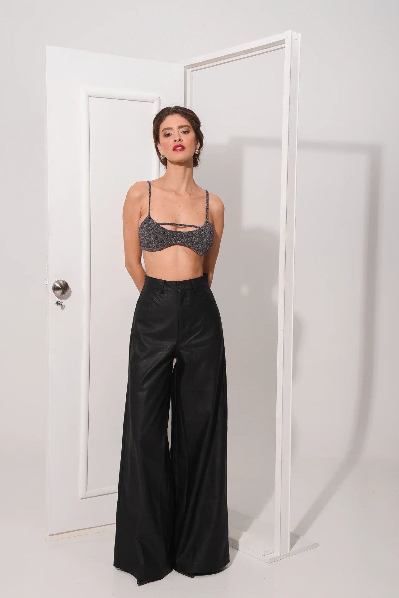 Bra τοπ με γυαλιστερή όψη και λεπτές, ελαστικές τιράντες.