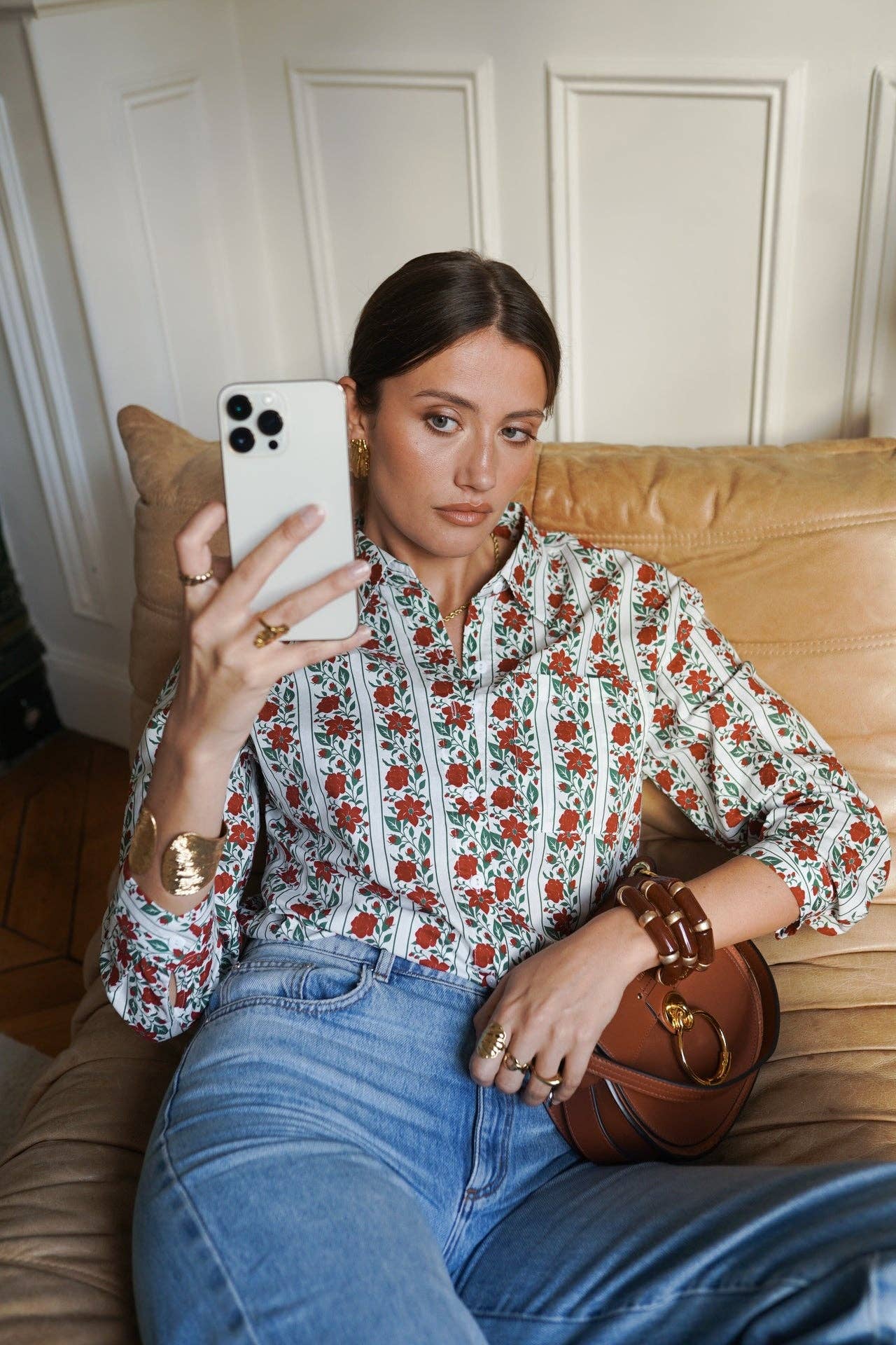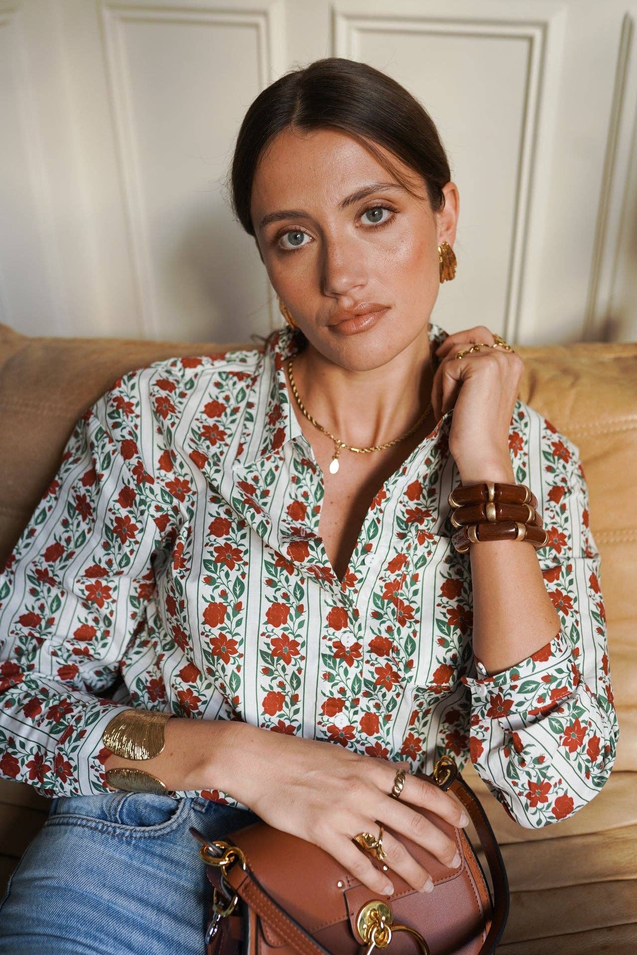 Printed shirt in green and red tones crafted from lightweight, flowing fabric. Made to be worn day after day.