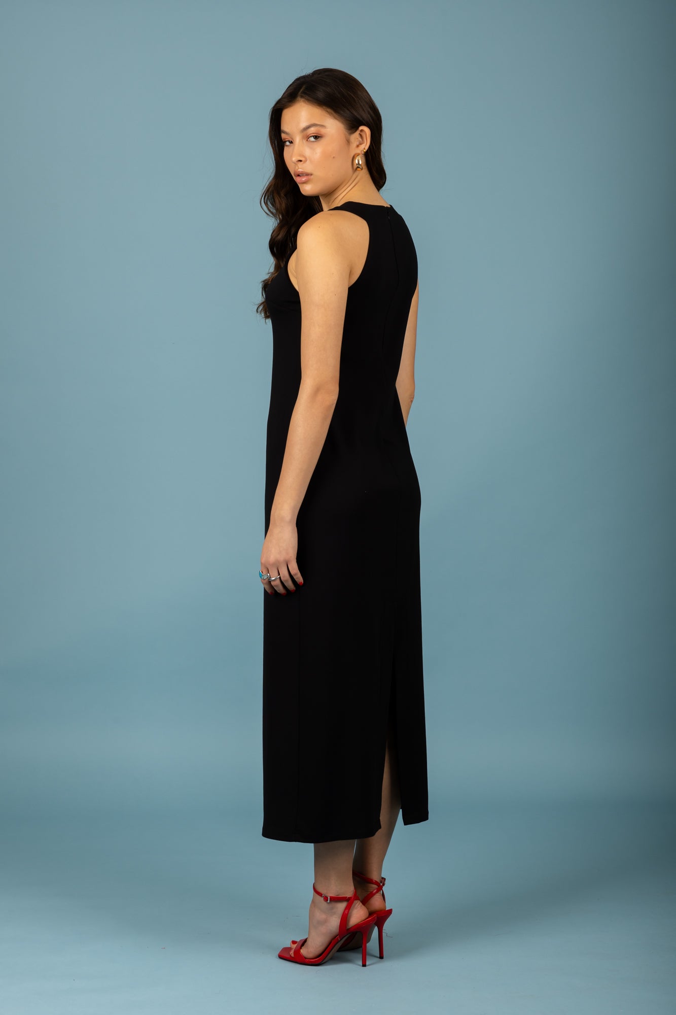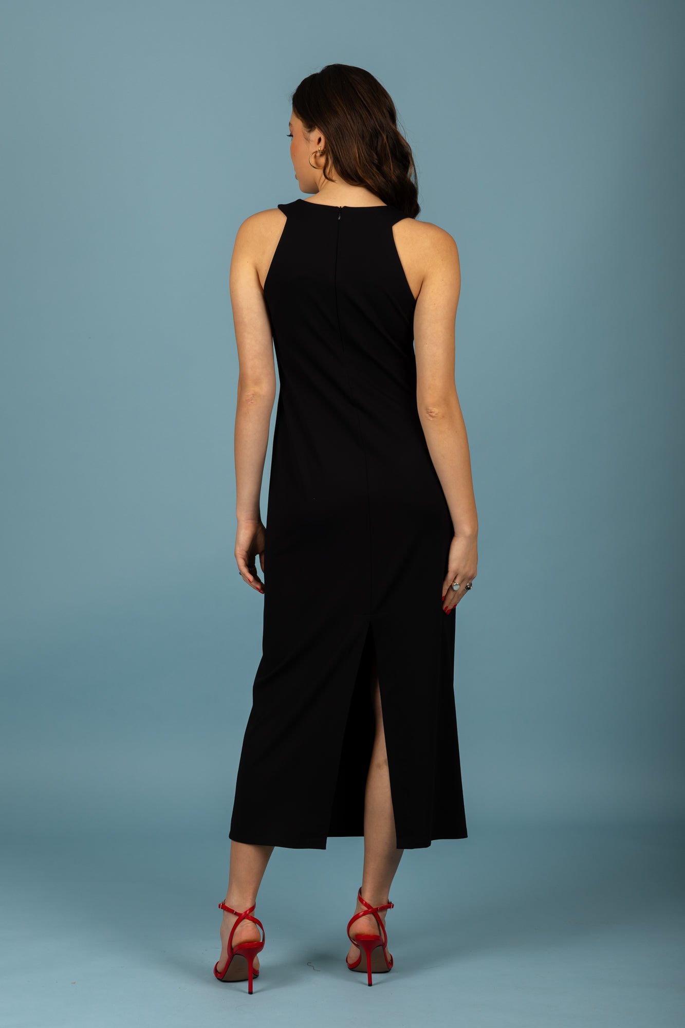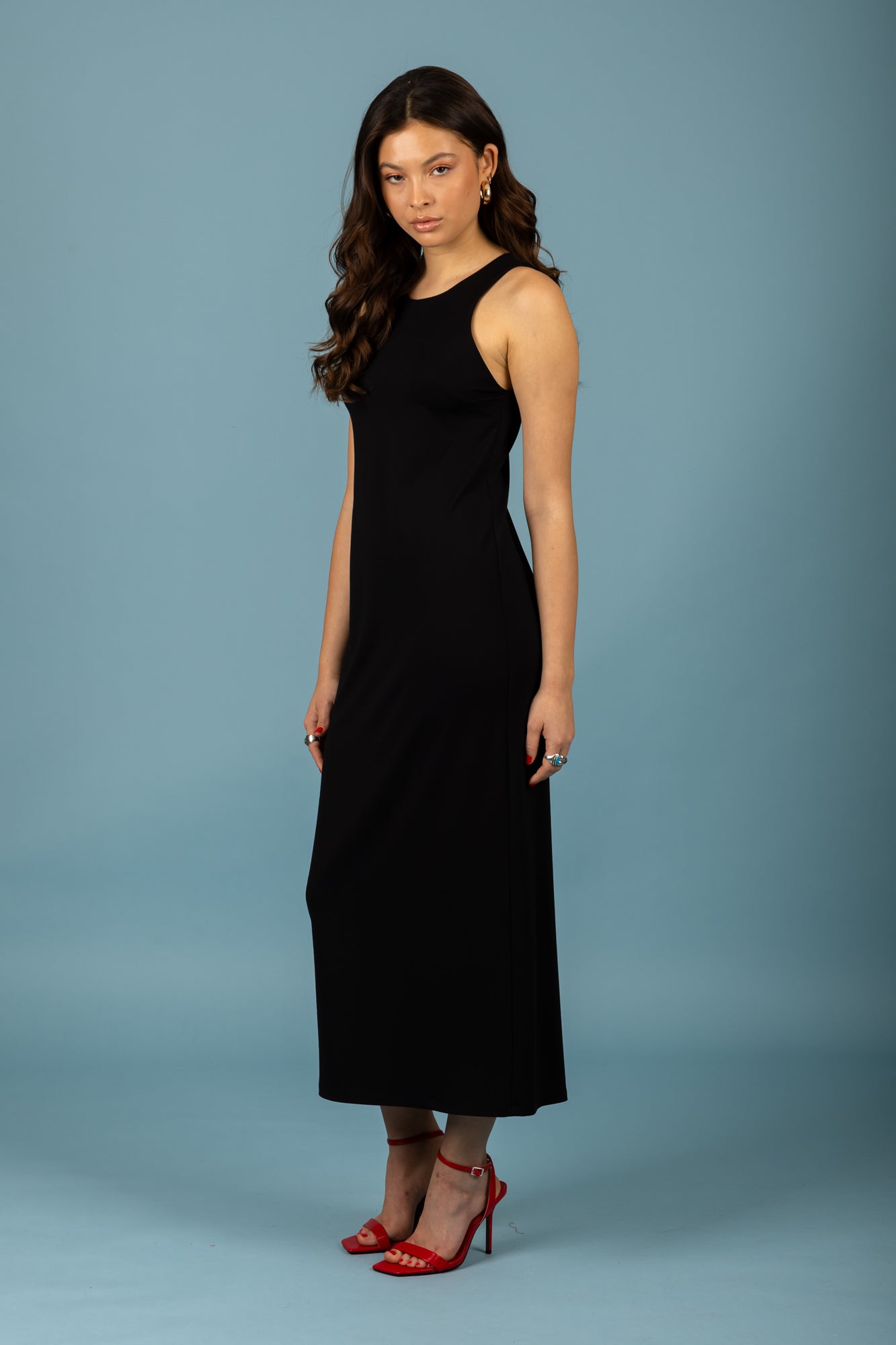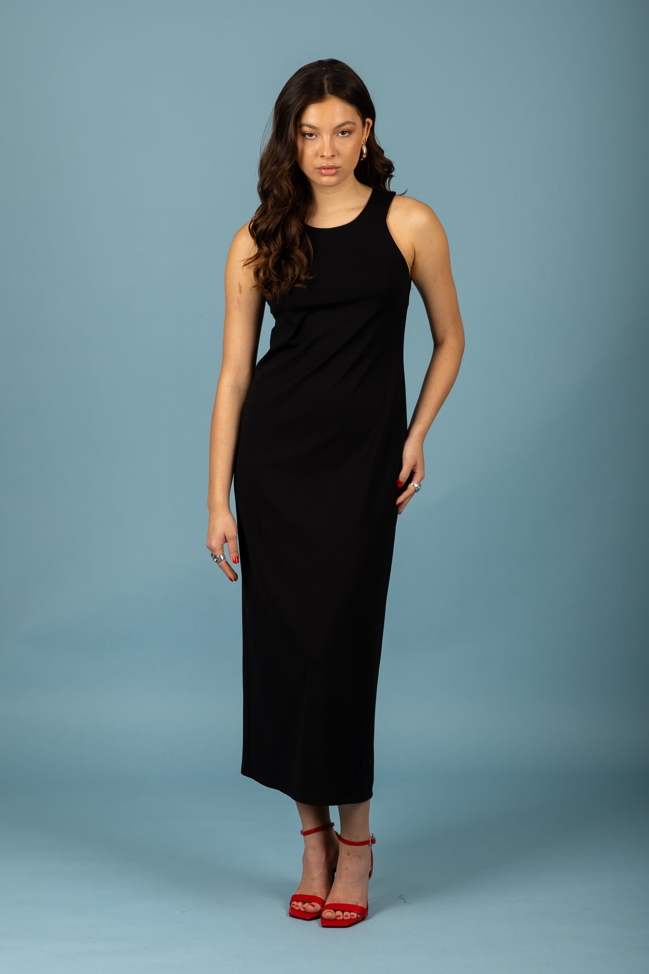 Long, sleeveless dress in straight cut.