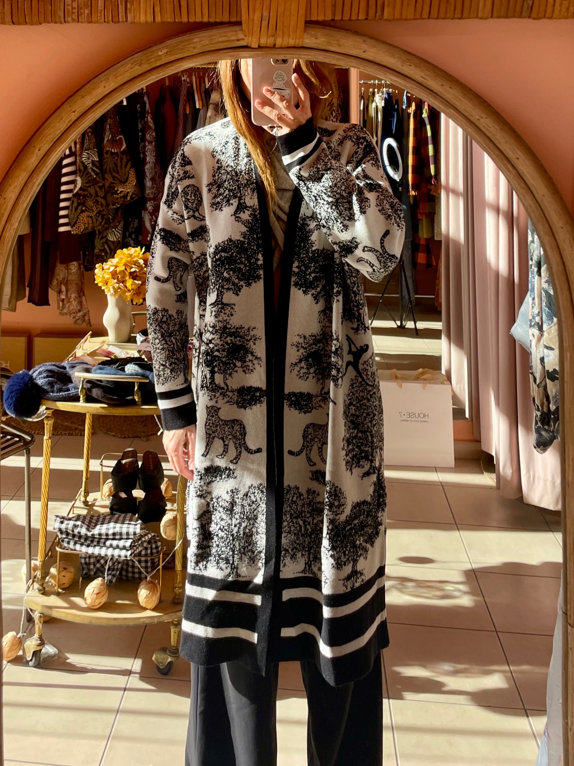 A breath of escape blows through your wardrobe. This long, open-front cardigan charms with its jungle print populated with felines and majestic trees, available in soft and contrasting tones. The striped edges at the cuffs and hem enhance its graphic character while structuring the silhouette.