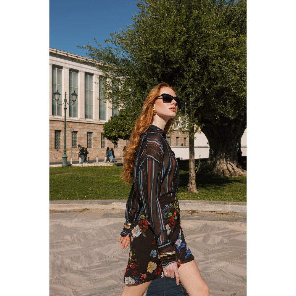 Wrap mini skirt with floral motif on chocolate hue silky fabric.