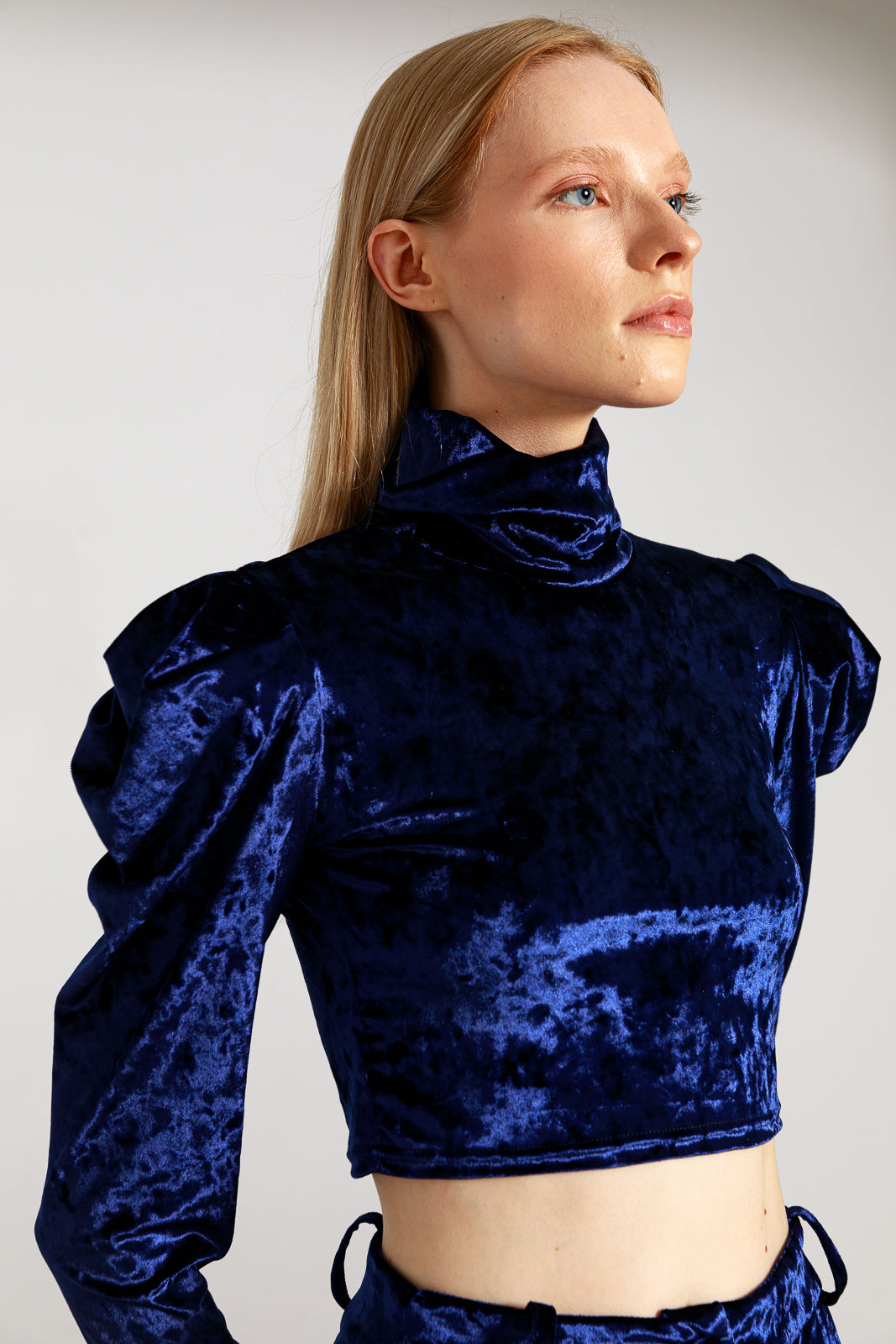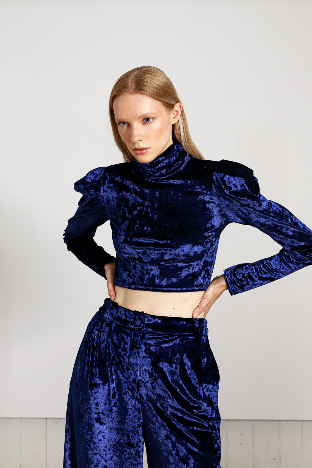 A new crop top addiction. Thea velvet top has dramatic shoulders and pairs magically with Kaia trousers and high waisted jeans.