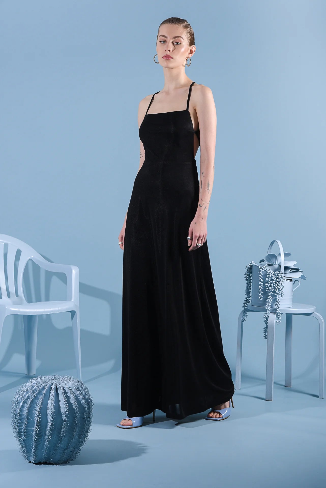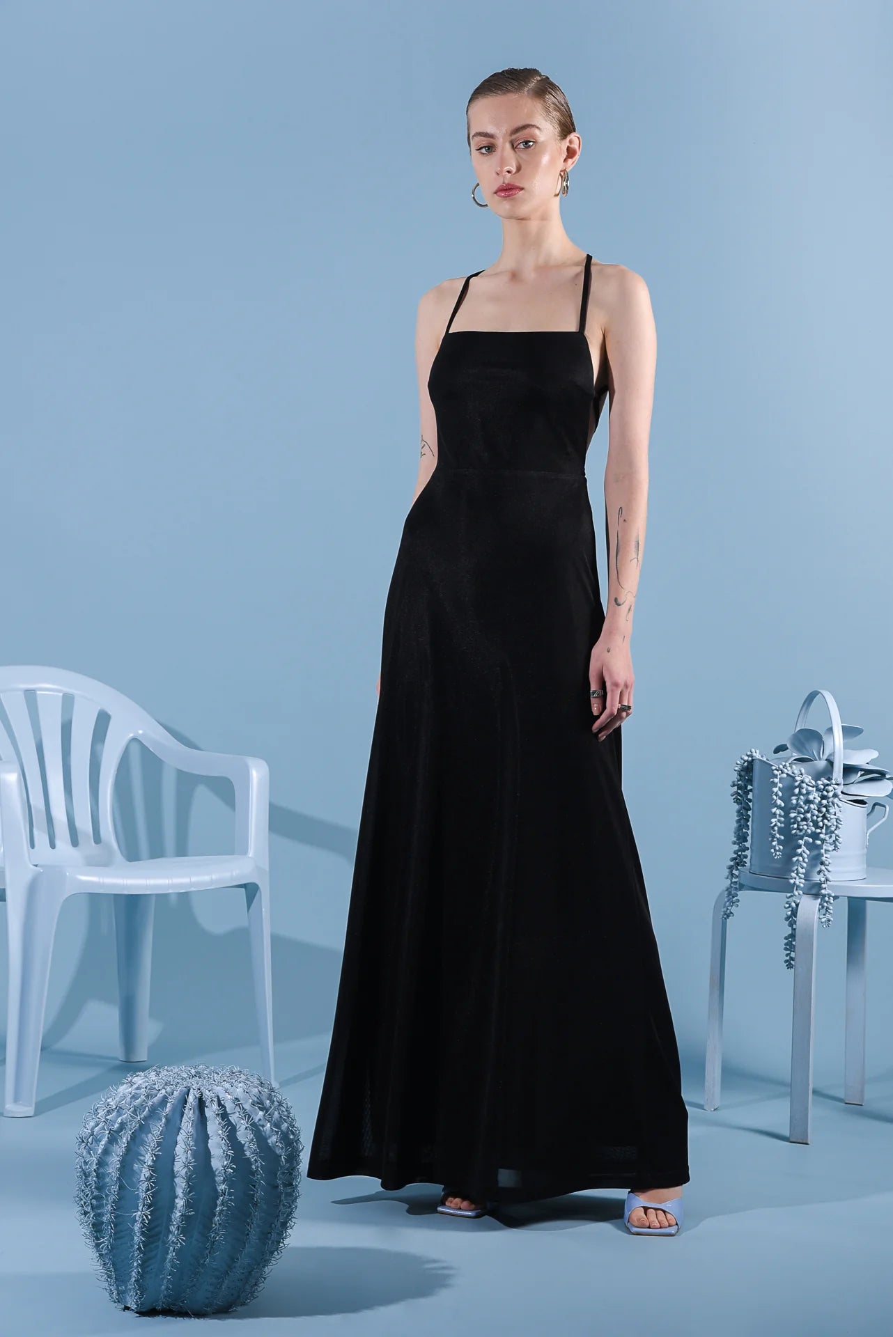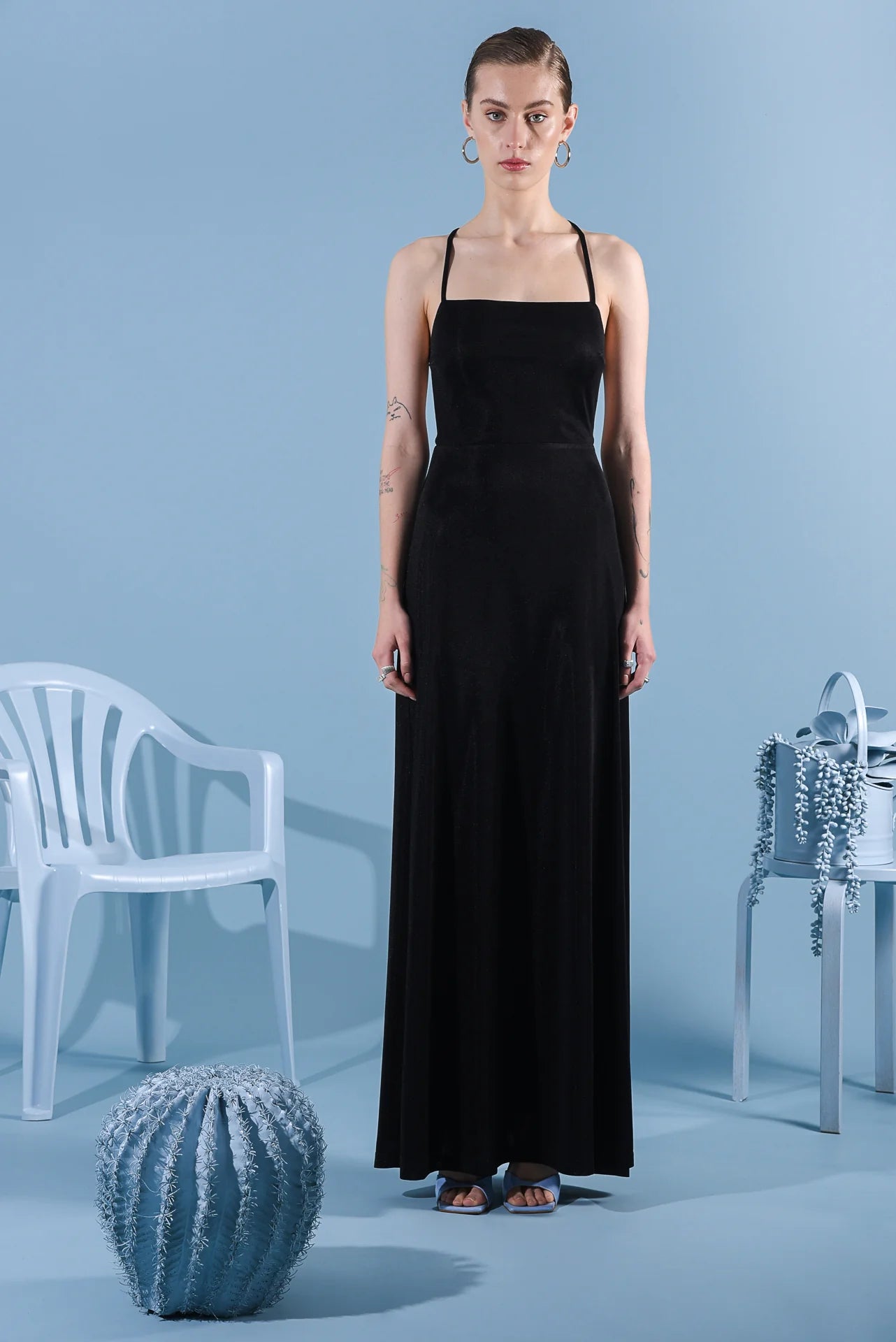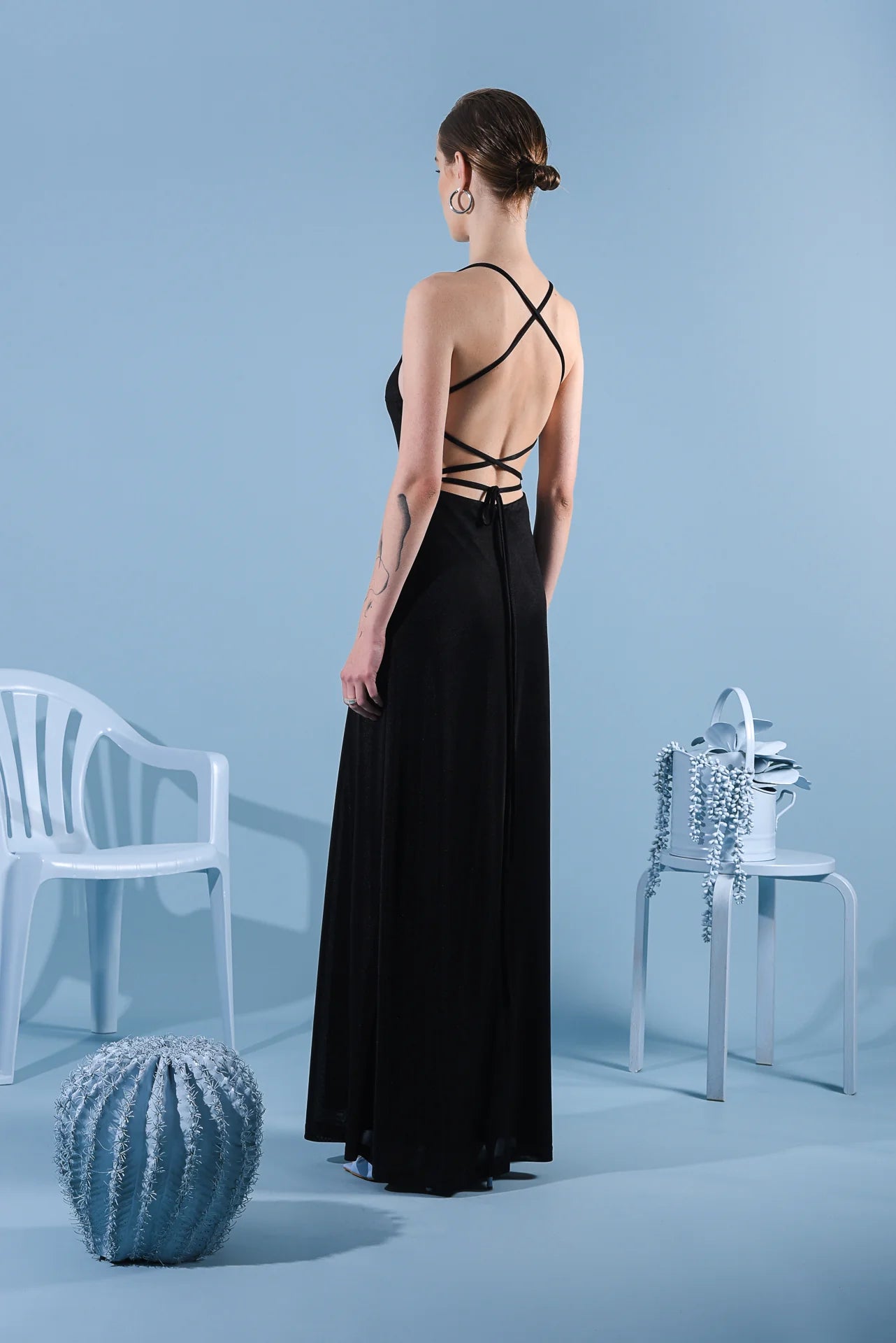 Maxi dress, crafted from elasticated fabric. Its low back is decorated and adjusted with laces, while it has caro-shaped design on the front.